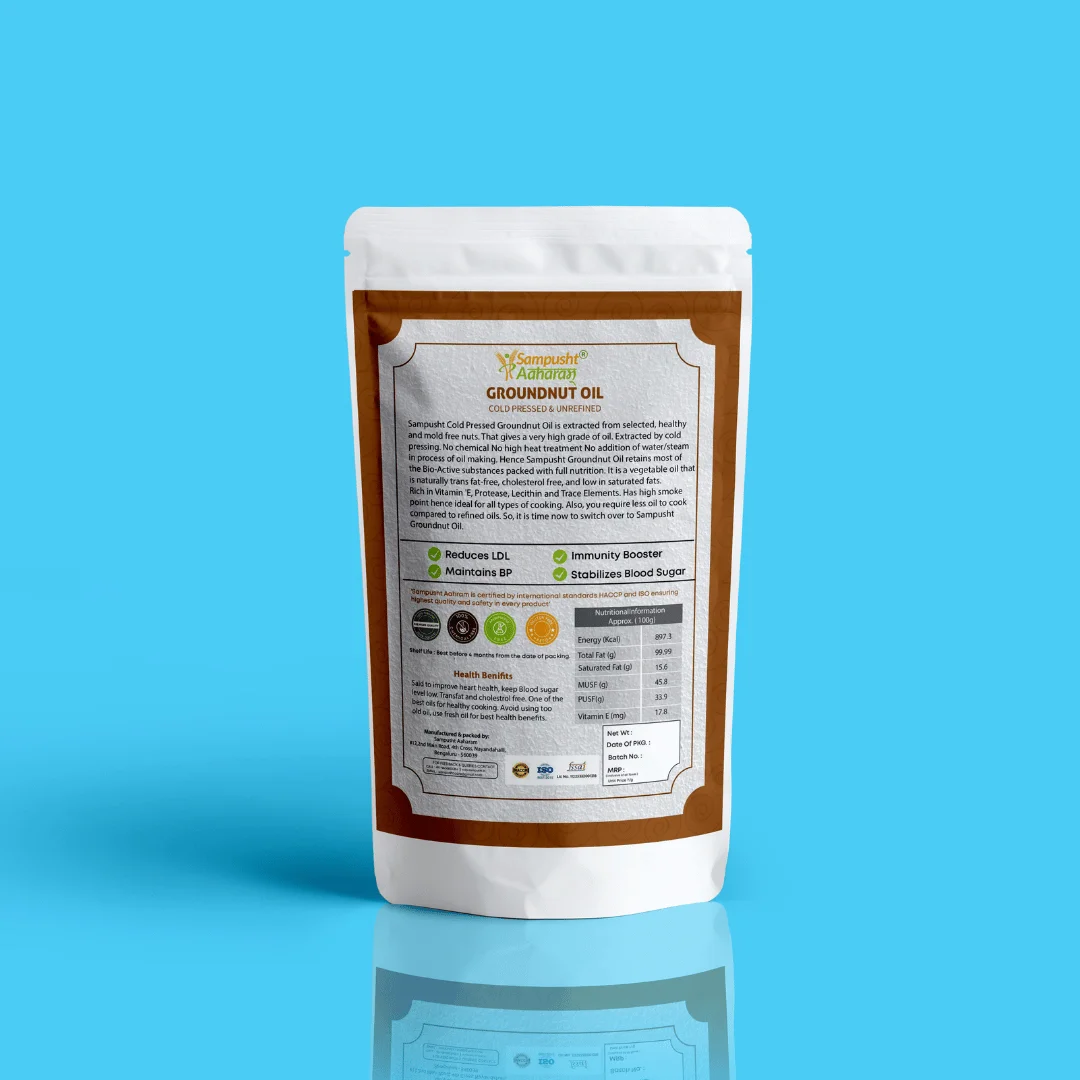 Our Sampusht Groundnut Oil is a heart-friendly cooking oil extracted from premium edible-grade peanuts through the cold-pressing method. Freshly prepared and naturally filtered, it retains its nutrition, aroma, and authentic taste. It is not just oil, it is a healthy choice for everyday cooking.