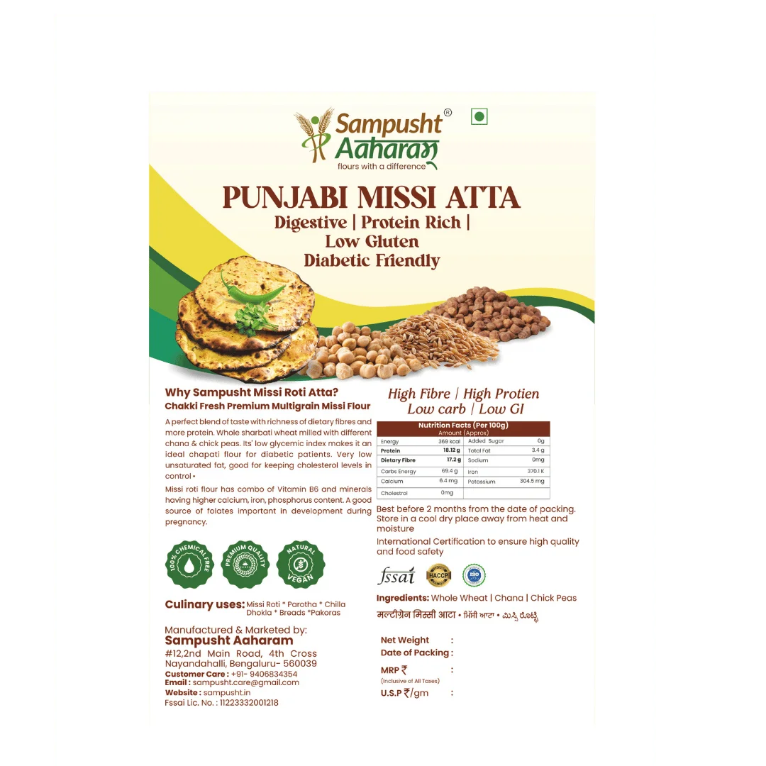 At the core of this delightful blend is the whole chana variety, meticulously milled at low temperatures to preserve its essence. Rich in dietary fiber and natural protein, Missi Atta offers a wholesome dose of nutrition that your body will love.